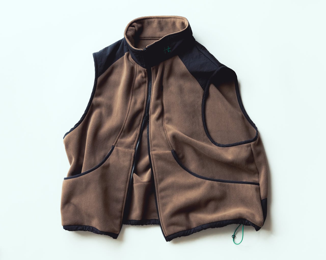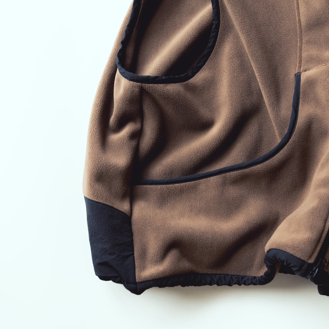 This is a fleece over-vest made from soft, thick, and plush short-pile fleece, combined with durable nylon material strong enough to carry ski poles.